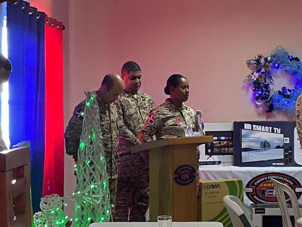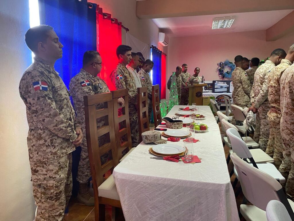 Capotillo, Dajabon.- Como parte de las tradicionales actividades navideñas que cada año se realizan en las diferentes zonas fronterizas del país, la Dirección General del Cuerpo Especializado de Seguridad Fronteriza Terrestre “CESFronT”, realizó un agasajo navideño, con una cena alusiva a la epoca y rifas para los miembros de esta institución que le sirven a la patria en la Escuela de Capacitacion Fronteriza Terrestre, apostada en el Campamento militar ” Héroes de la Restauración”.